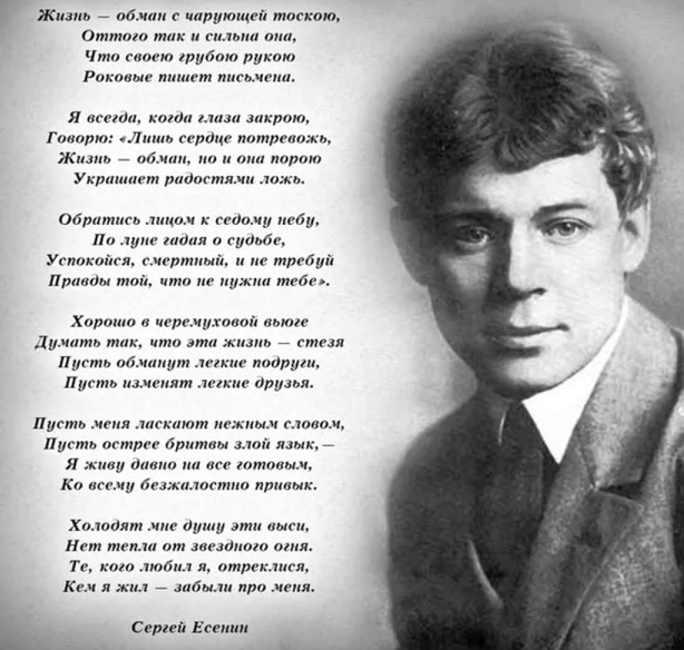 Тончайший лирик, волшебник русского пейзажа, удивительно чуткий к земным краскам, звукам и запахам, Есенин был большим и смелым мастером стиха. Он жил как писал – ярко, широко, с любовью к родному краю и его людям.